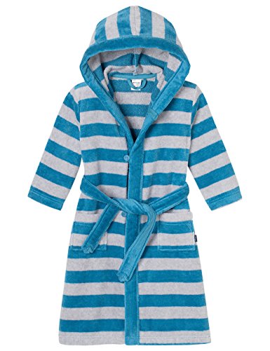 15% Polyestergeringelter Bademantel für Jungen aus der SCHIESSER-Serie "Eisbär & Co." mit Blockringeln in Grau-Melange und Blau Kapuze, Bindegürtel sowie Knopfleiste zwei aufgesetzte Taschen im vorderen Bereich weißer, gestickter Eisbären-Kopf auf der Rückseite in kuschelweicher Webvelours-Qualität